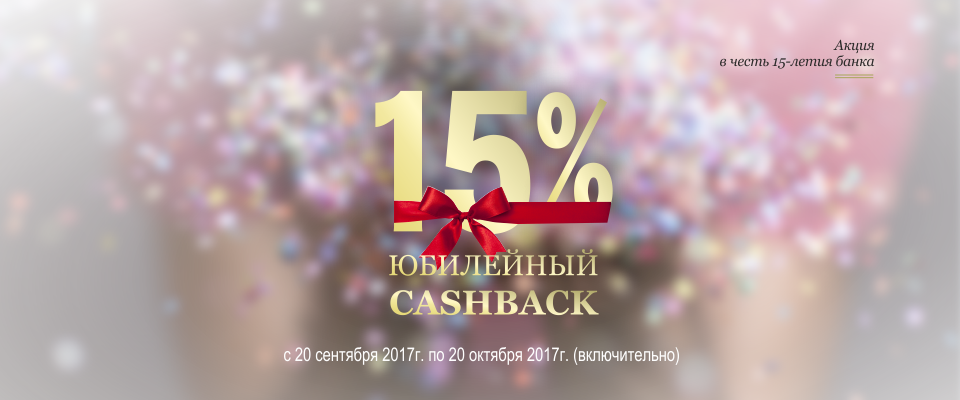С 20 сентября 2017г. по 20 октября 2017г. совершая расходные операции* по Вашей карте на сумму не менее 15 000 рублей, Вы получаете бонус от АО Банк «Национальный стандарт» в виде возврата части денежных средств (кэшбэк) - в размере 15% от суммы покупок в следующих категориях: «Рестораны и кафе», «Кинотеатры», «Билетные кассы, театральные и продюсерские агентства». Сумма бонуса не может превышать 1500 рублей.